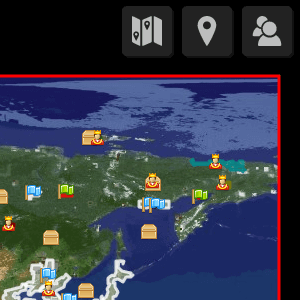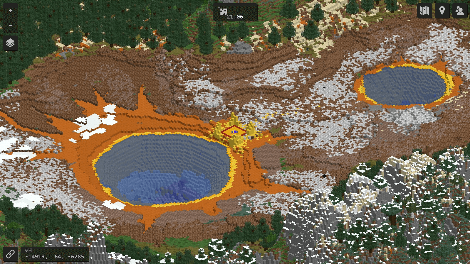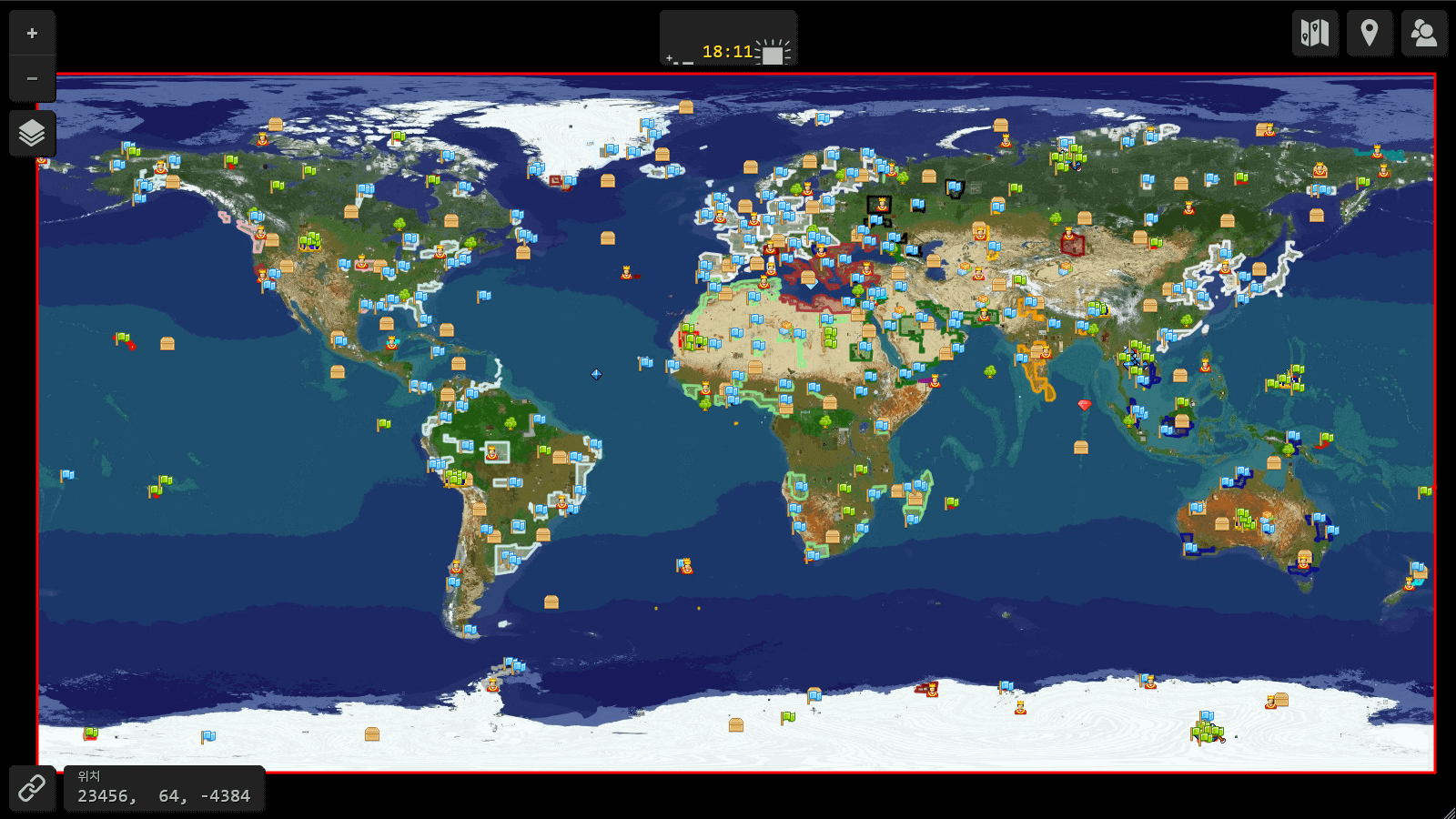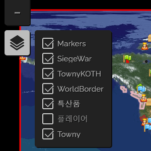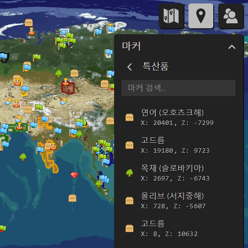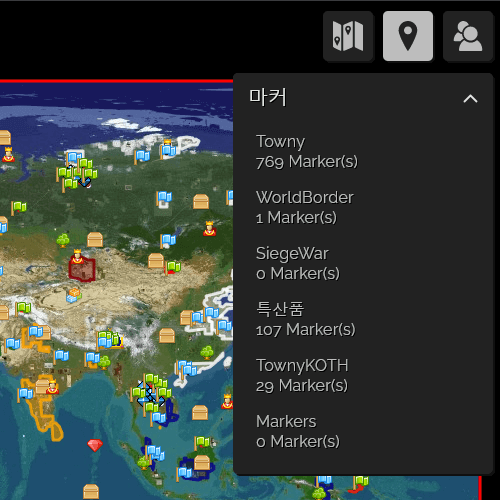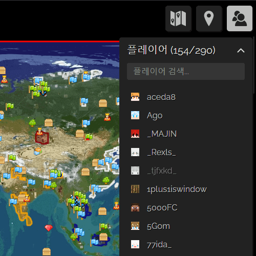 마우스 스크롤을 통해 맵을 키우거나 작게 할 수 있고, 각 버튼을 통해 지도의 다양한 기능을 찾아볼 수 있습니다. 지도에는 유저들이 만든 마을, 특산품, 점령전, 그리고 접속중인 플레이어들의 각자의 현재 위치가 표시됩니다.